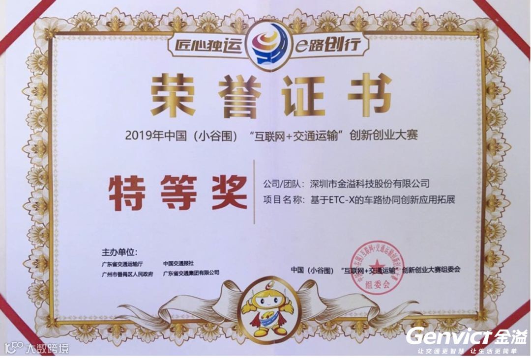 11月29日,2019年中国(小谷围)“互联网+交通运输”创新创业大赛(简称双创大赛)全国总决赛在广州圆满收官。继11月24日在智慧公路主题赛决赛上获得特等奖后,金溢科技“基于ETC-X的车路协同创新应用拓展”项目在总决赛上再度力克群雄,获得双创大赛的最高荣誉——总决赛特等奖,出色展现了金溢科技的创新水平和科研实力。