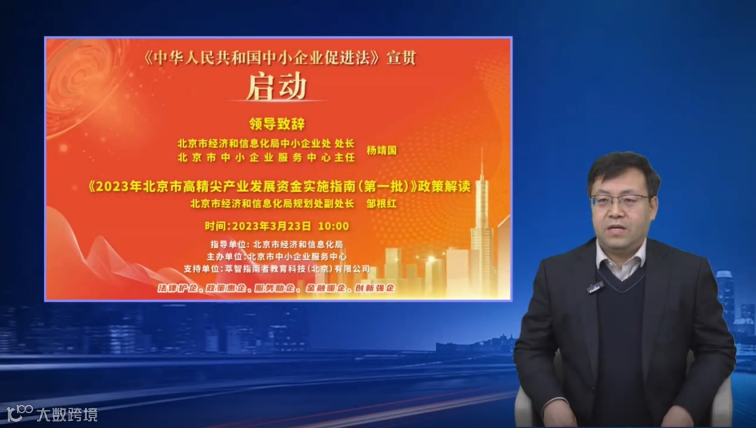 北京市经济和信息化局中小企业处处长、北京市中小企业服务中心主任杨靖国在活动中致辞。北京市经济和信息化局规划处副处长邹根红针对《2023年北京市高精尖产业发展资金实施指南(第一批)》进行政策解读并互动答疑。