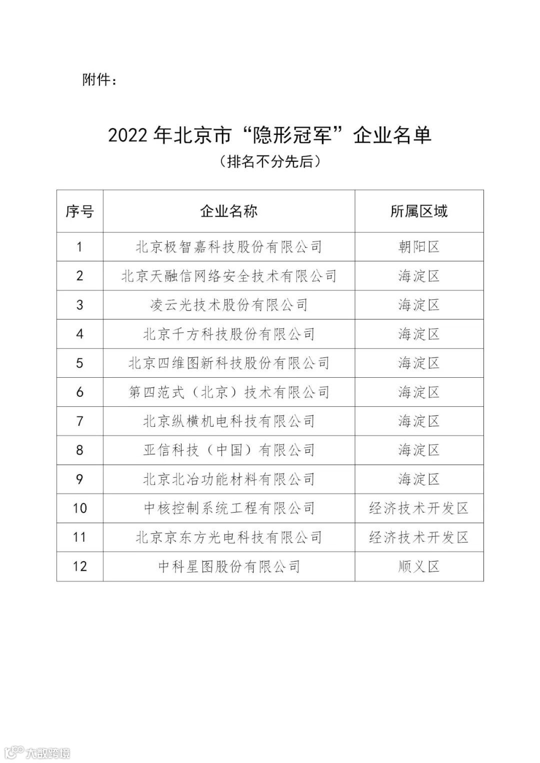 为贯彻落实我市“发展一批‘隐形冠军’企业”的战略部署,进一步完善企业梯度培育格局,支持企业“专精特新”高质量发展,我局会同市工商联组织开展了2022年北京市“隐形冠军”企业的申报、审查和评审工作。前期已将拟认定名单予以公示,按照有关程序,2022年北京市“隐形冠军”企业名单已经确定,现予以公告。