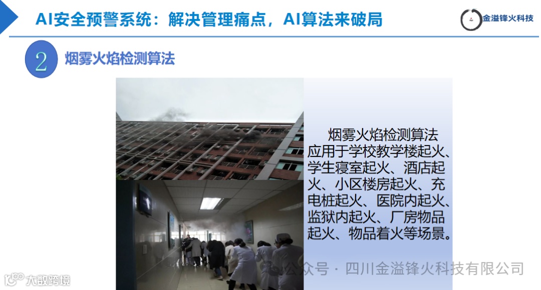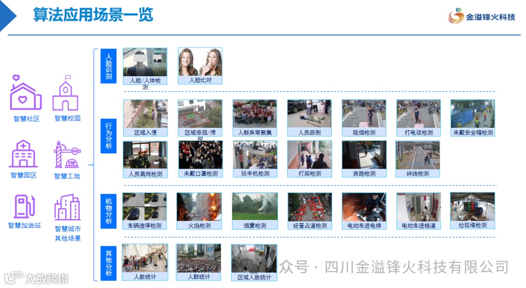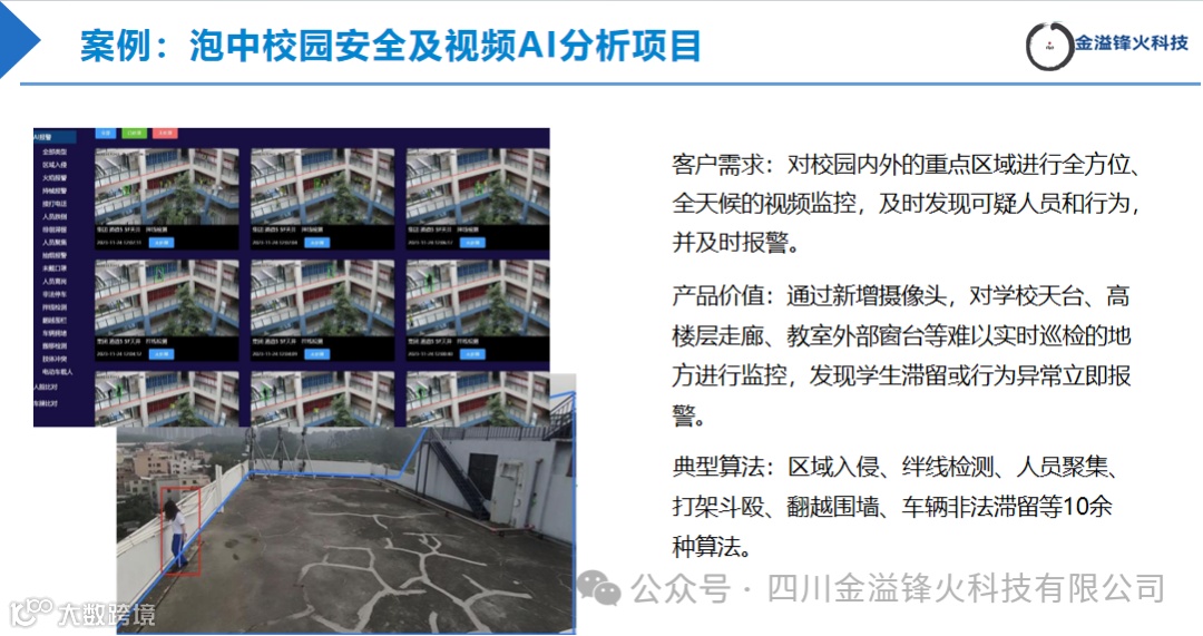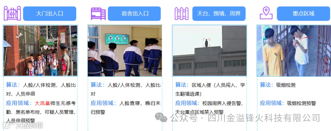 系统是通过AI人工智能分析视频流,用公司开发的专业算法将违规视频提取出来,发送给管理方。及时有效地阻止火灾、烟雾、盗窃、霸凌、入侵、聚集、抽烟、跳楼、查寝、翻墙、乱堆乱停等事件的发生。