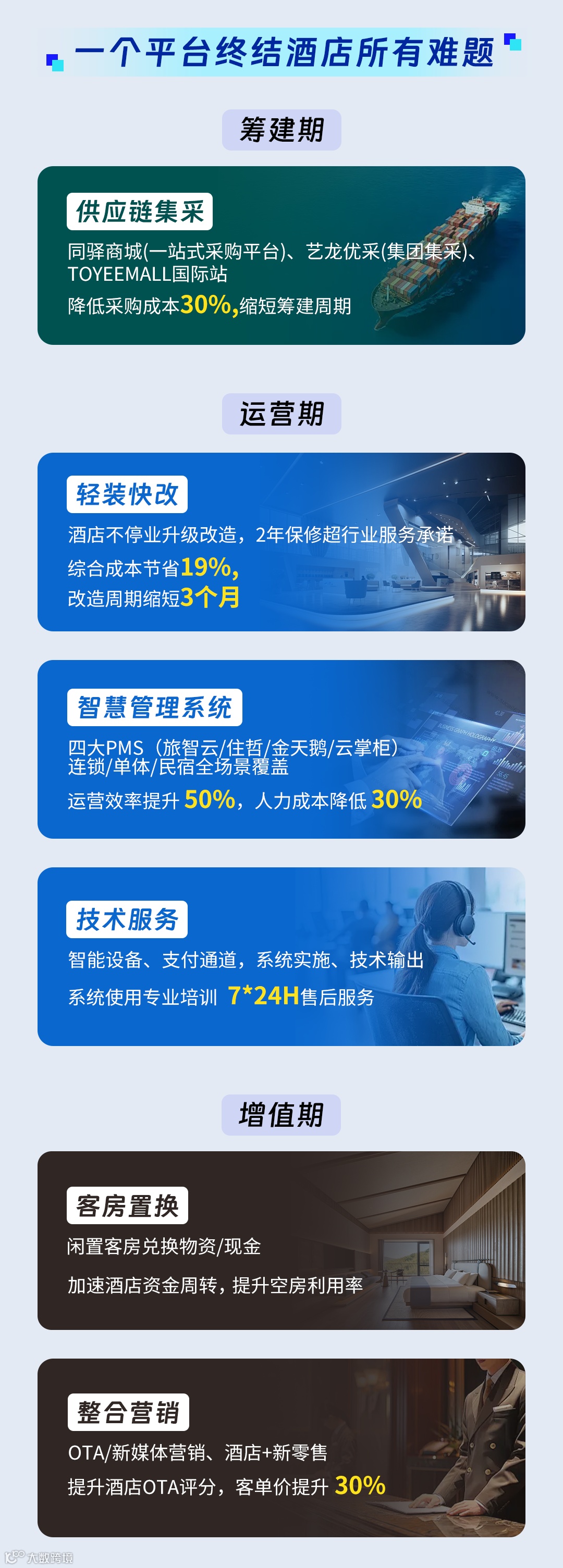 作为由旅智科技与同驿科技合并成立的新品牌,智驿科技整合双方技术、资源与业务优势,现已构建起覆盖酒店“筹建期-运营期-增值期”的全生命周期数智化服务体系。
