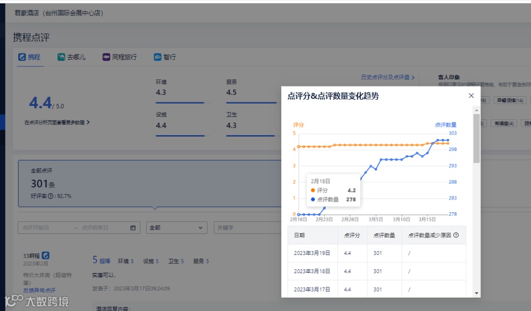 1个月,帮助君豪商务酒店从4.2分提升到4.4分。