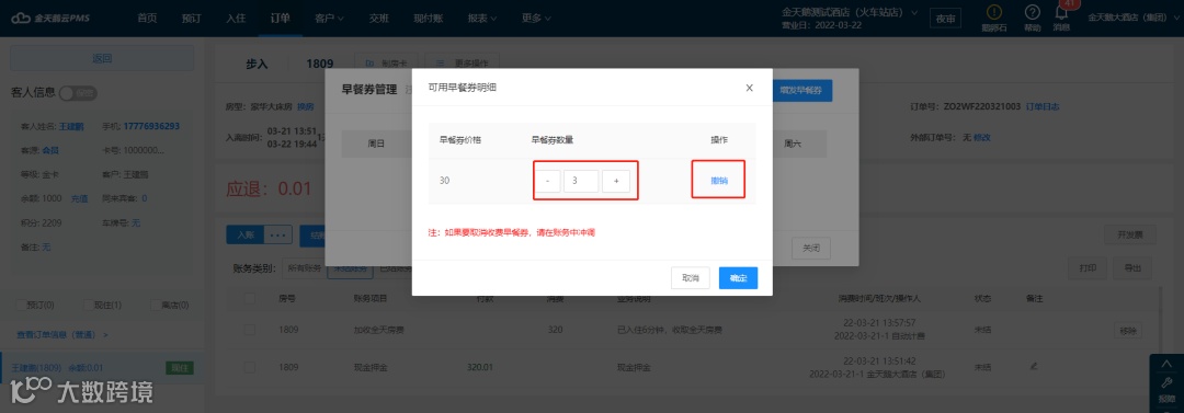 对发错或发多早餐券的房间,进入云pms>订单>早餐券>增发>选择要冲减的日期>可用早餐券明细>选择数量>撤销,可进行冲减撤销,满足酒店更多业务场景需求。