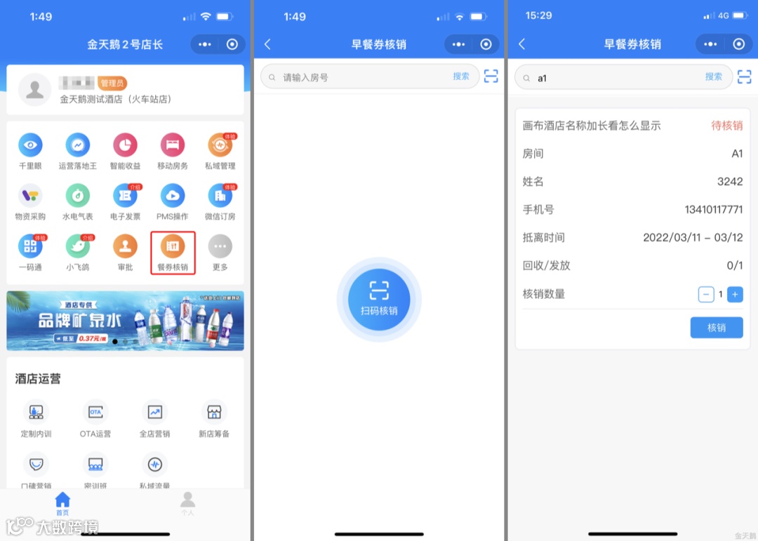 ①新增移动端早餐券核销功能:提供手机扫码,输入房号核销客人早餐券。
