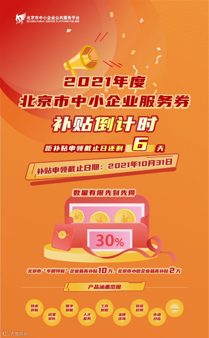 北京市2021年度中小企业服务券发放工作即将进入尾声,全年补贴额度所剩不多。有服务需求的企业,请抓紧最后机会,额度有限,先到先得↓↓↓