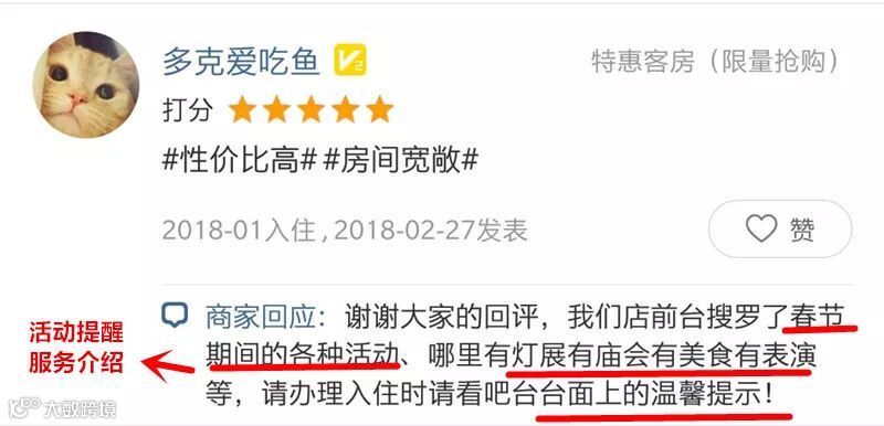 用户评论是消费者预订酒店时,了解酒店的重要窗口,我们可以在回复评论的话术中,加入更多酒店地理位置,客房服务细节等酒店服务。