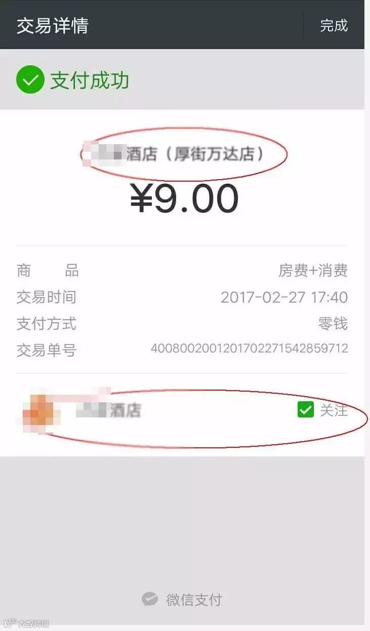 5)打通线下微信支付。支付即会员,客人使用微信支付后,自动关注酒店微信公众号;