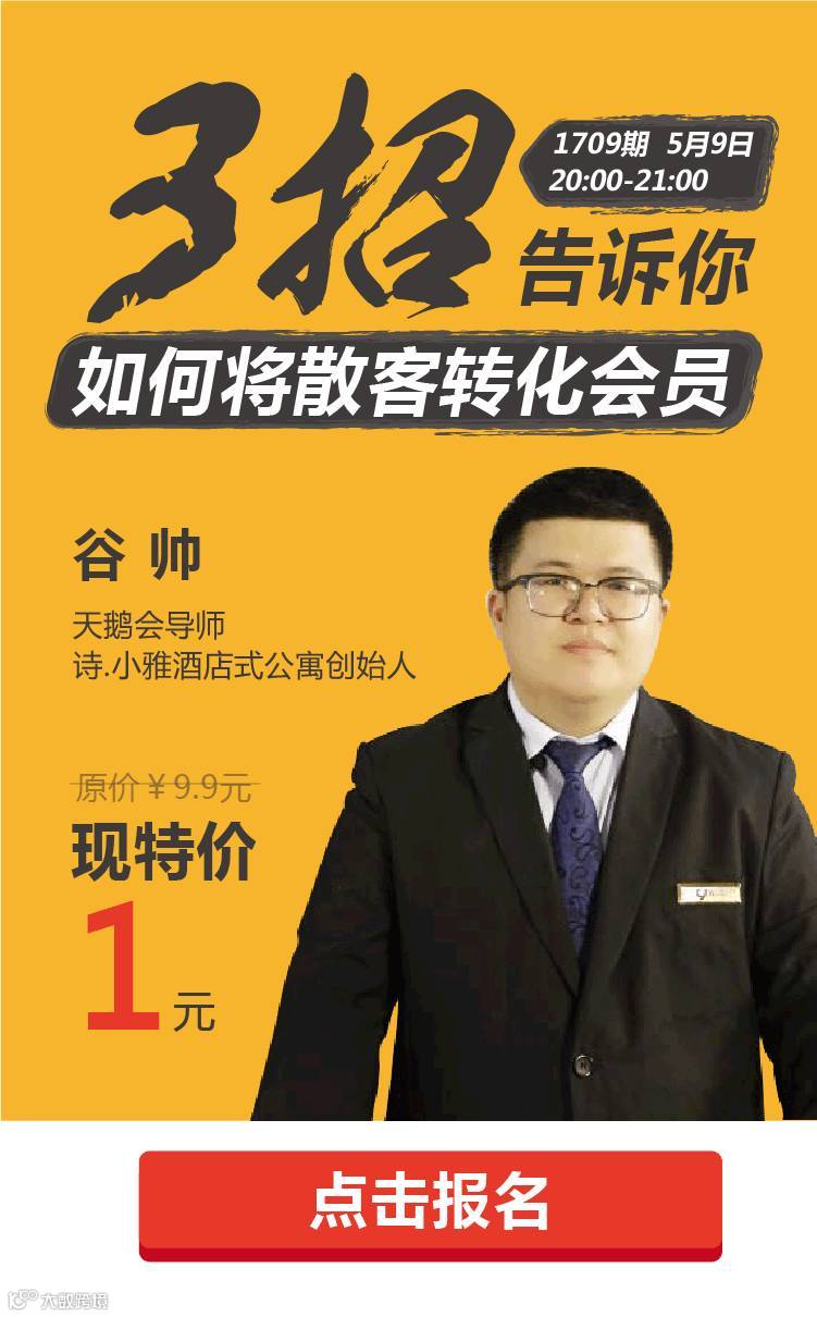 酒店如何做好会员?5月9日晚8点,天鹅会导师、诗.小雅酒店式公寓创始人谷帅为我们分享关酒店散客会员体系搭建,课程重点围绕散客会员开发与价格设定技巧,本节课程价值 ¥9.9,现优惠特价仅需¥1,不到1个包子钱。