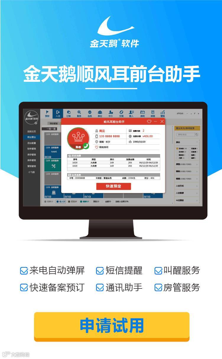 金天鹅顺风耳前台助手可以随时调出顾客的资料来(当然前提是经过酒店员工服务之后不断的填充客户资料信息),顾客在开房时,其资料会随着会员卡显示出来。这时前台主动说一句:“XX先生,您好!一共是XXX,因为您是我们店的VIP,本次消费已经为您优惠了XX”,这样做会让顾客印象比较深刻。