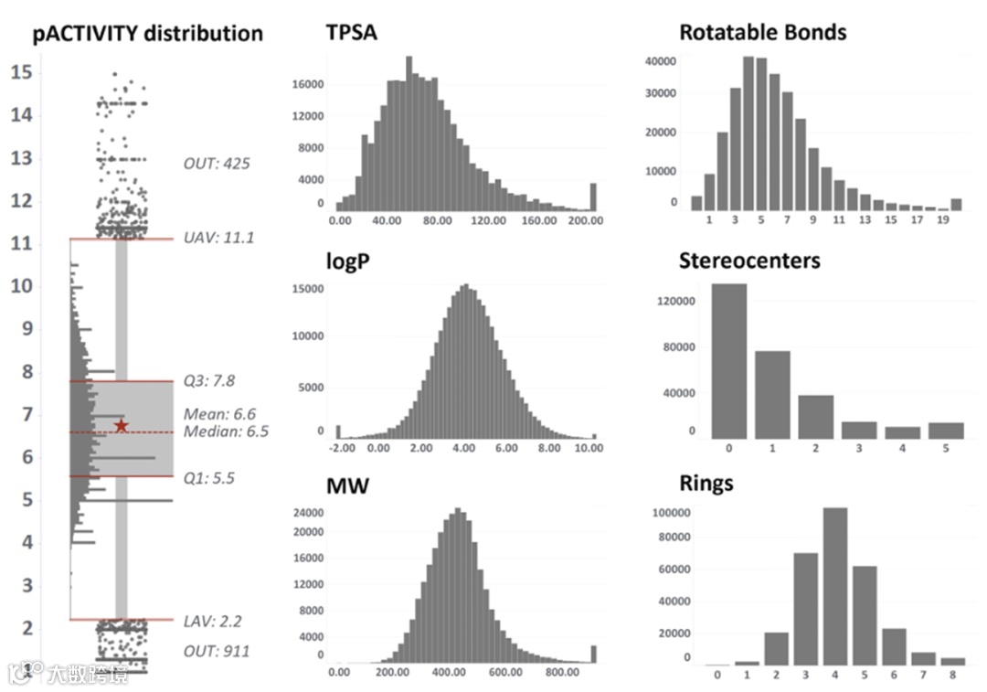 图3. 46个选定靶点的整个化学空间的关键属性分布。箱线图描述了活性值,而直方图描述了若干理化性质(TPSA、logP、MW、rotB等)的分布,帮助理解数据的化学空间偏倚。