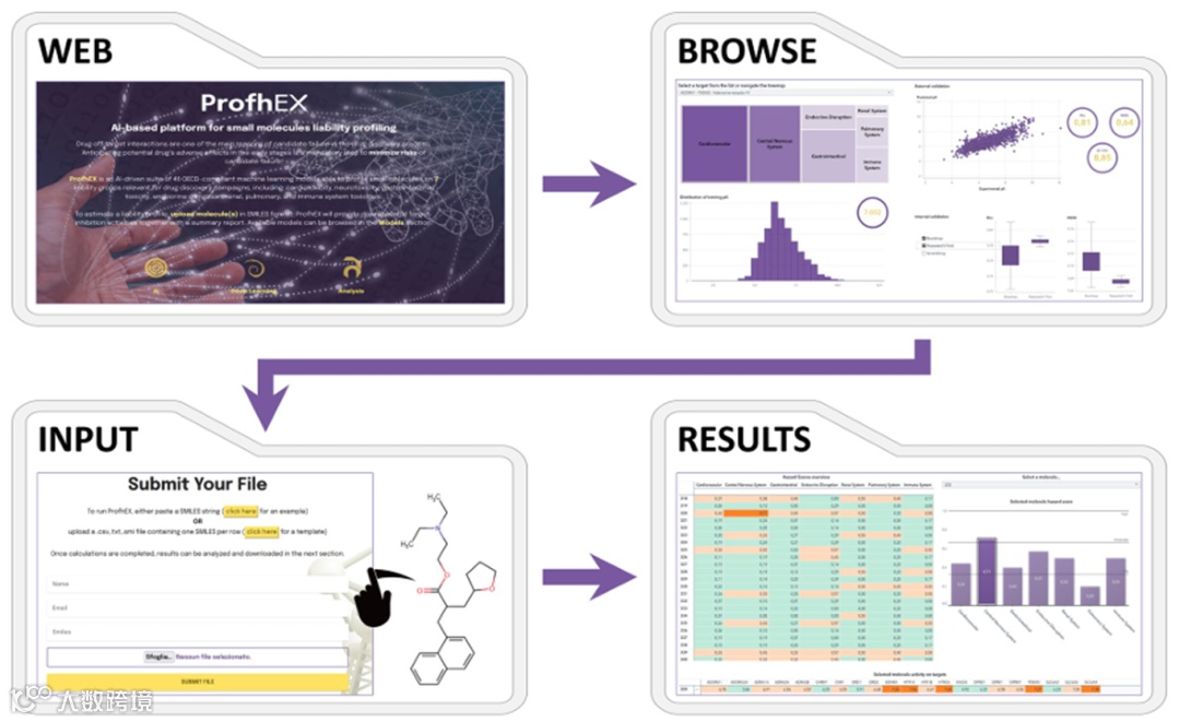 2023年Lunghini等人在Journal of Cheminformatics上发表了ProfhEX——一个基于AI的小分子风险评估平台。该平台融合了公开数据库ChEMBL与商业数据库GOSTAR的数据,通过严格的标准化流程与多重验证,构建了覆盖46个关键风险靶点(即已知与药物毒性强相关的生物靶点)的预测模型,可对小分子在7个相关的毒性类别上进行风险评估。所有模型均按OECD-QSAR原则进行设计与验证,并可免费在线使用,平台访问地址:https://profhex.exscalate.eu/。