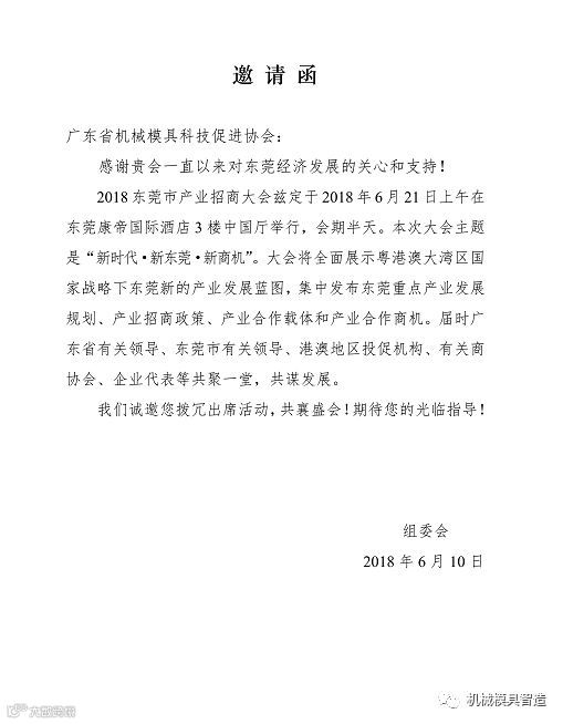 6月21日(周四)上午9:30,东莞市委、市政府召开东莞市招商大会,地点在东莞市区康帝国际酒店3楼中国厅。有意参会者请即刻报名,协会在本周五前需回复东莞市有关部门。