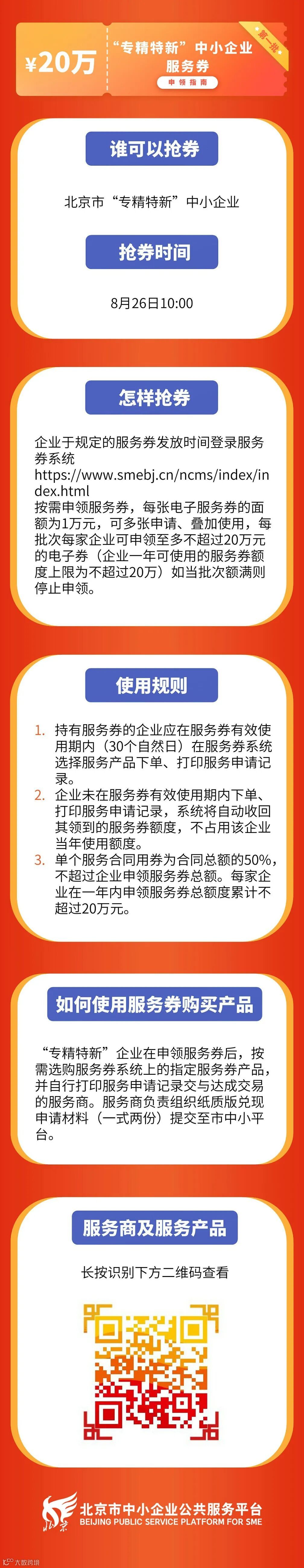8月26日,800万北京市“专精特新”中小企业服务券正式开抢。为进一步支持北京市“专精特新”中小企业培育工作,北京市经济和信息化局面向两批次认定的819家企业发放“专精特新”中小企业服务券,每张服务券面额1万,单个企业最高可领取20张,用于购买42家指定服务券服务商的服务产品。在购买服务产品时,服务券可叠加使用,最多使用20张,即最高抵扣20万元,最高抵扣合同金额的50%。服务券有效期为30天。