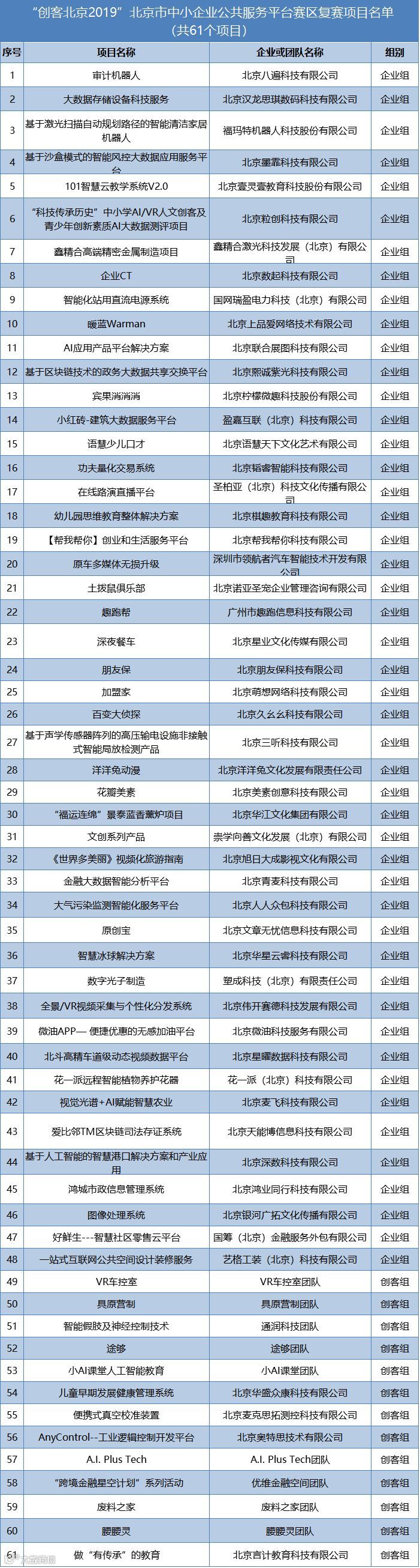 2019年“创客中国”北京市中小企业创新创业大赛暨“创客北京2019”创新创业大赛初赛阶段已圆满结束,经过一个多月严格筛选和激烈角逐,全市12个赛区共计671个项目成功晋级复赛,现将入围复赛的项目名单公布如下,后续赛事安排请继续关注北京市中小企业公共服务平台网站和平台官网微信公众号。