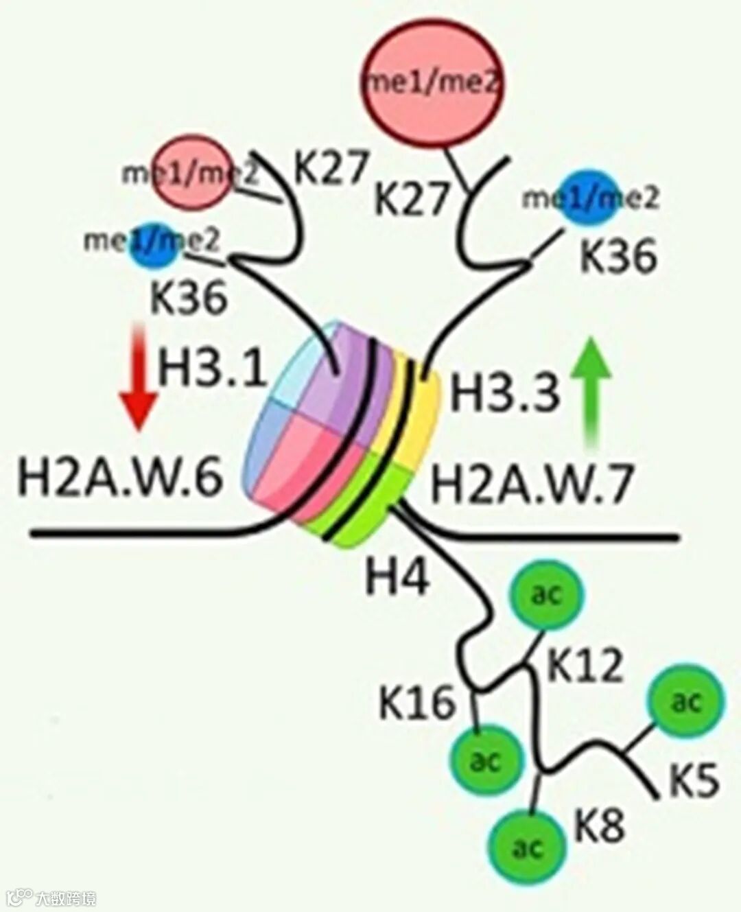 作者的研究表明,CAF-1伴侣蛋白的缺失导致H3.1和H3.3变体的甲基化谱发生变化。H3.3结婚的改变会影响K27和K36位置的甲基化状态,而这两个位置对于转录调控和DNA损伤反应至关重要。具体而言,他们发现K36me1/2/3在H3.3中占主导地位,而由于低丰度,在H3.1中不易检测到。而大多数H3.1K27-R40肽段在K27位置以K27me1为主。Zeocin处理会诱导基因毒性应激,并改变部分组蛋白的水平,AT突变体中H3.3K27单甲基化标记的水平会显著增加。