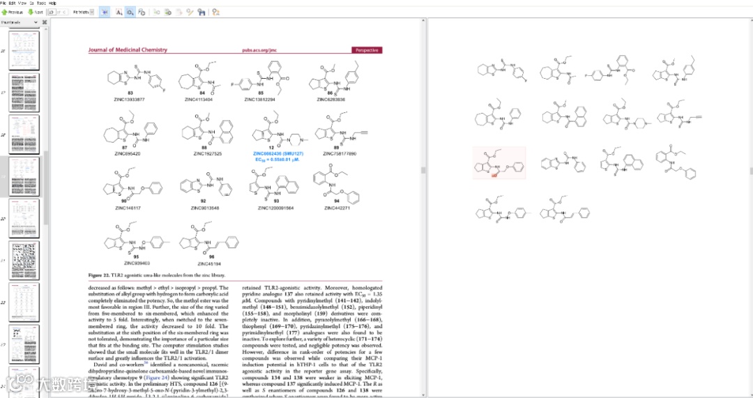 CLiDE的界面整体类似于Acrobat Reader。导入要提取结构的文献后其会显示整个文献的浏览视图,进行结构提取时则会在另一个平行视图展示提取出的结构,并且平行视图中结构的位置与原文档中的位置相对应,方便进行浏览。