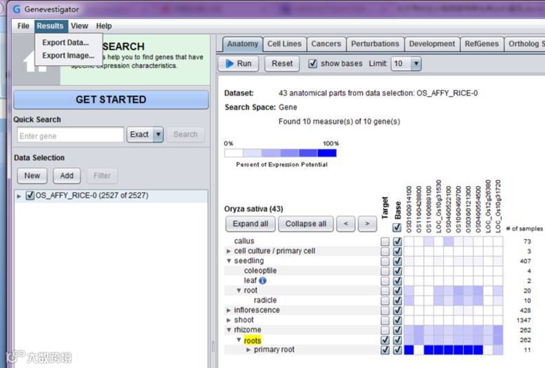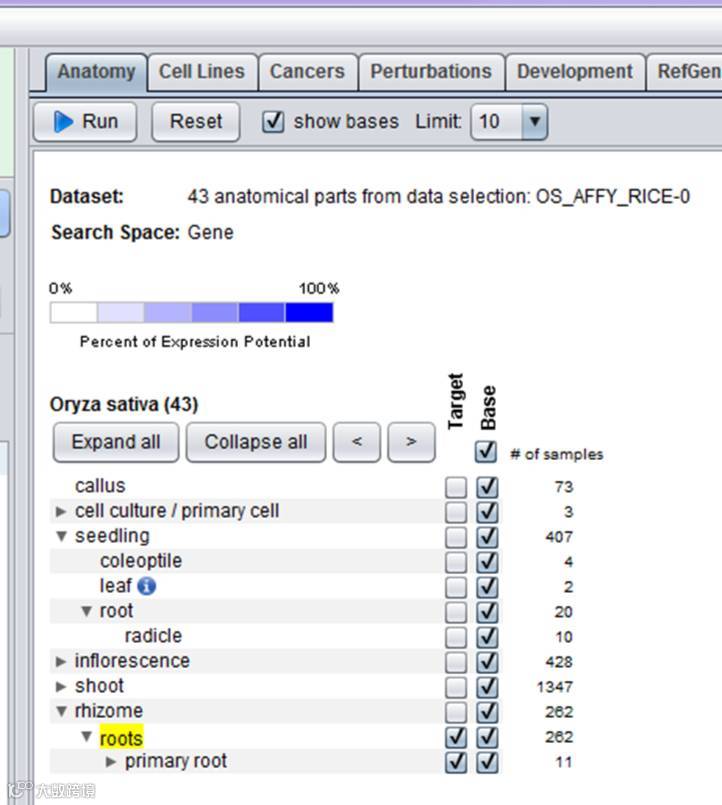 接下来,我们以水稻为例,利用Genevestigator寻找在根部的特异性表达基因。