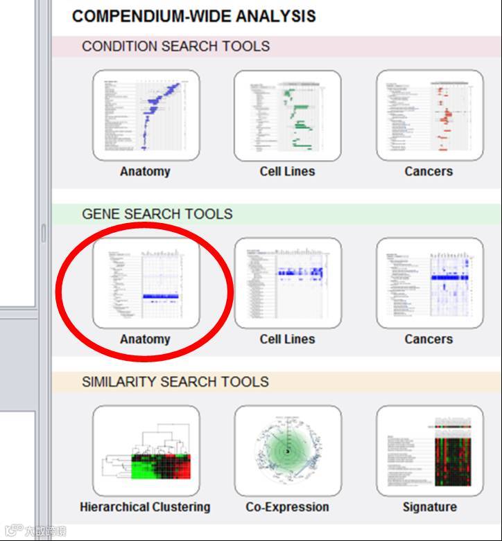 在主界面的右侧的“GENE SEARCH TOOLS”中选择“Anatomy”,即是我们告诉GENEVESTIGATOR,我们有感兴趣的组织,我们希望寻找组织特异性表达的基因。