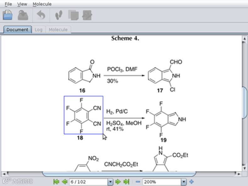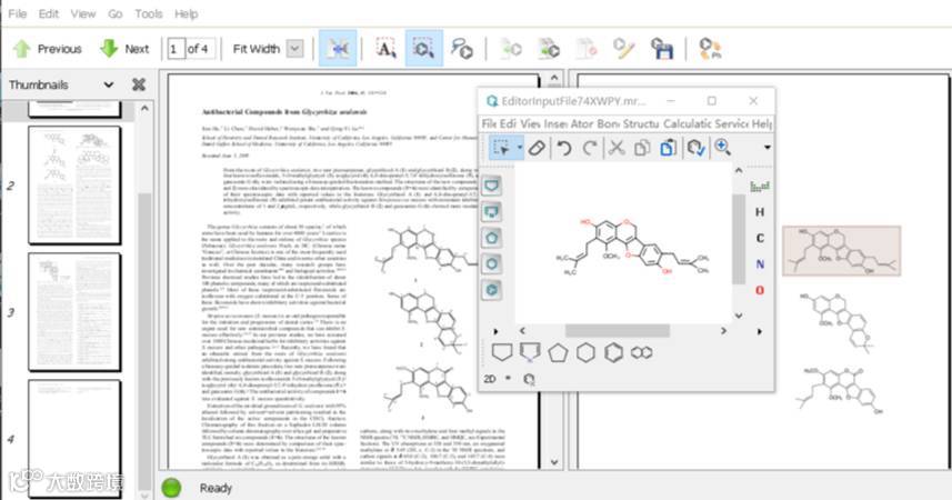CLiDE的界面类似于Acrobat Reader,它提供了一个文档页面的缩略视图。CLiDE提取的化学结构会显示在另一个平行的视图,并且化学结构的位置对应原文档中的位置,方便用户浏览。