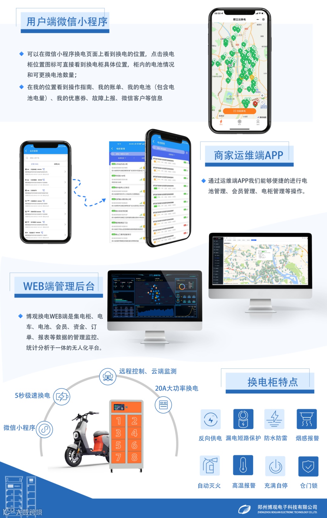 博观科技专注于智能充/换电产品研发及充/换一体系统服务,拥有自主研发换电柜核心技术,迭代更新速度快,提供“产品+平台+服务”一体化解决方案,涵盖充换电柜硬件、嵌入式软件、云平台、核心器件等领域,标准化生产,规范化仓储,能够满足客户定制化需求并扶持运营。目前累计销售投放运营8000多台智能换电柜,智能理电定位终端30多万台。