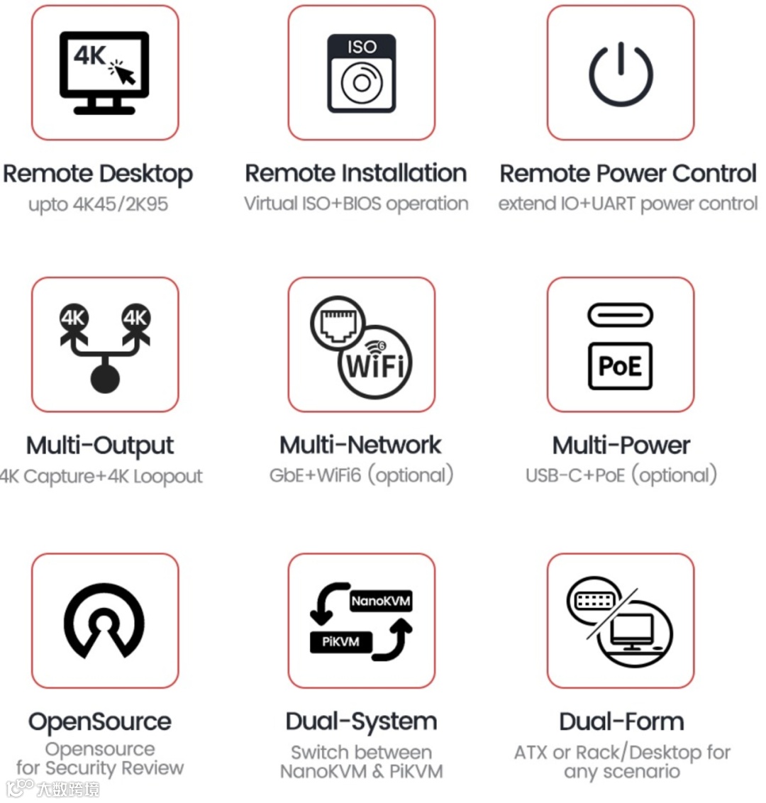 还支持音频传输,UEFI/BIOS支持,模拟USB鼠标键盘,模拟USB ISO,IPMI,网络唤醒(WOL),WebSSH,自定义脚本,带有两路串行终端。