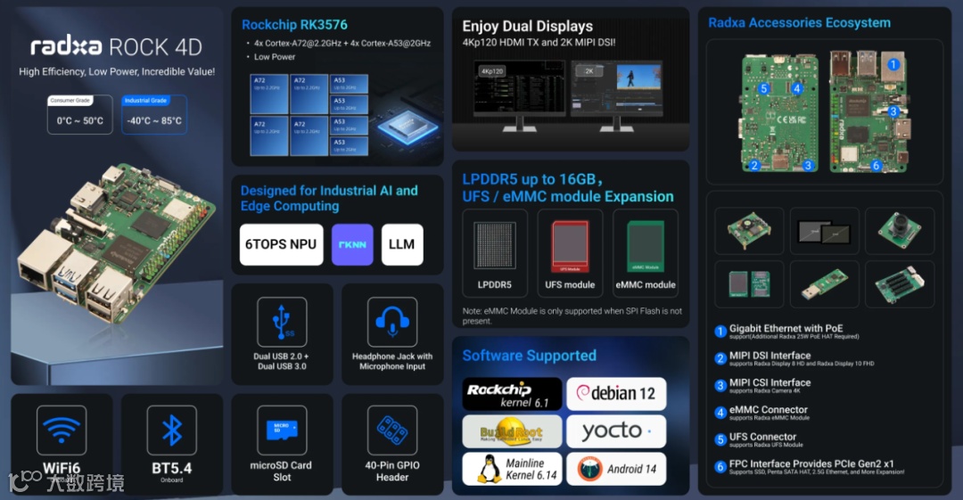 这次Radxa Rock 4D还有工业级(-40℃~85℃)和商业级(0℃~70℃)两种版本可选,工业级目前还没上架。