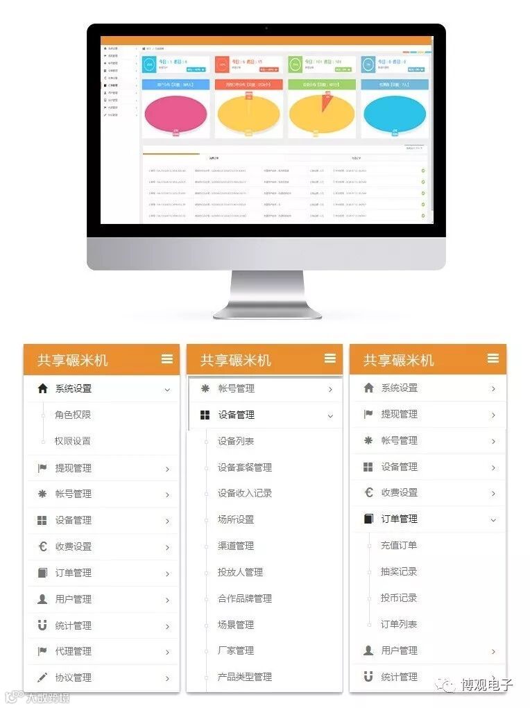 郑州博观电子科技有限公司的共享碾米机系统由通讯控制主板、触控屏系统、用户终端小程序、后台管理系统四大部分组成。