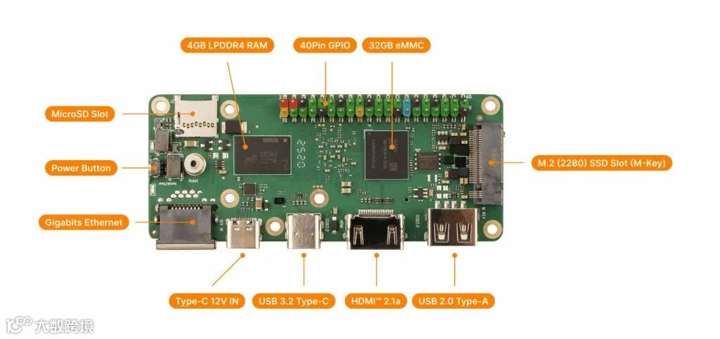 板载4GB LPDDR4内存和32GB eMMC,4MB SPI Flash。