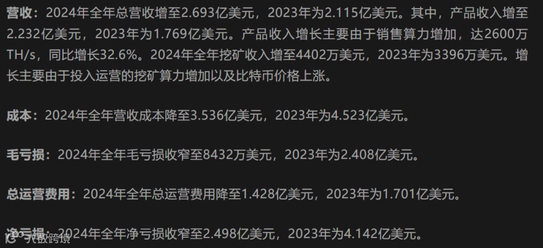 根据嘉楠科技公众号提供的数据,24年全年总营收2.693亿美元,