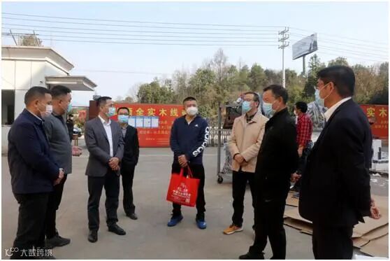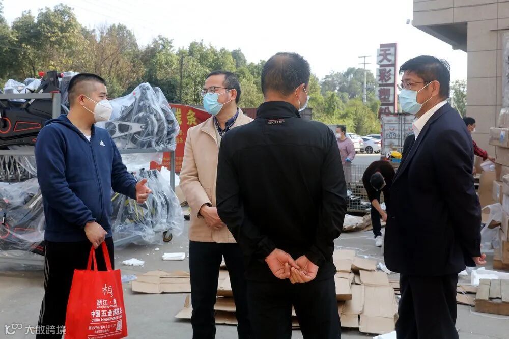2月25日,五金城集团领导夏霆、徐东方、胡元田、应健、王名寺、俞显恩在花街镇党委副书记、镇长李启航陪同下,前往结对企业之一的浙江乾铭工贸有限公司开展“三服务”活动,并向结对企业捐赠口罩、额温枪等防疫物资。