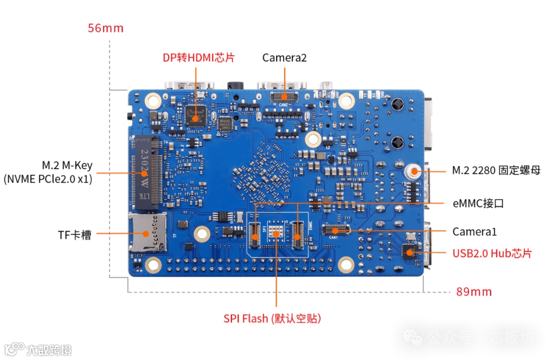 下面我们就看看他们在这三个地方上做了哪些工作,首先是尺寸更小了,从香橙派5的62x100缩小到56x89,也就比树莓派长了4mm。整个都比5小了一圈。