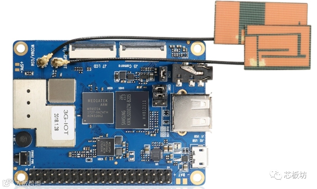 板载麦克风,有LCD接口,摄像头接口,耳机接口,一个USB Host 2.0接口,MicroUSB电源接口,还带有扬声器,电池的焊接点。40针扩展接口。TF卡插槽,SIM卡插槽也都有。