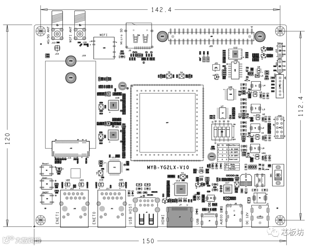 采用10层板高密度PCB设计,沉金工艺,无铅焊锡,有独立的接地信号层。核心板引脚接口采用邮票孔+LGA设计。一共222个引脚