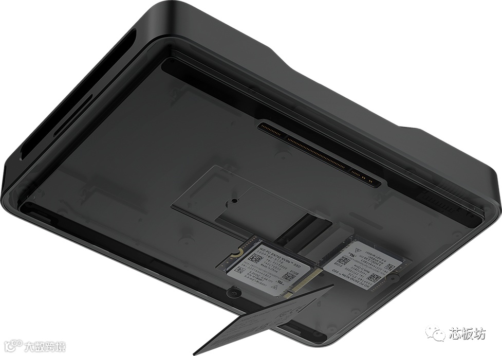里面内置的SSD官方也说无法更换,外面有一个可以装M.2 2230固态的插槽位置,还有磁吸的盖板。但是需要注意的是外面的这个固态插槽的速度是PCIe3.0的。