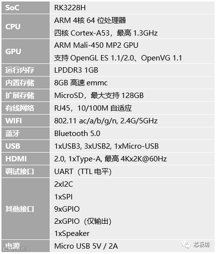 SoC使用瑞芯微rk3228H ,采用四核的Cortex A53 最高主频1.3GHz,GPU采用 ARM Mali-450 MP2