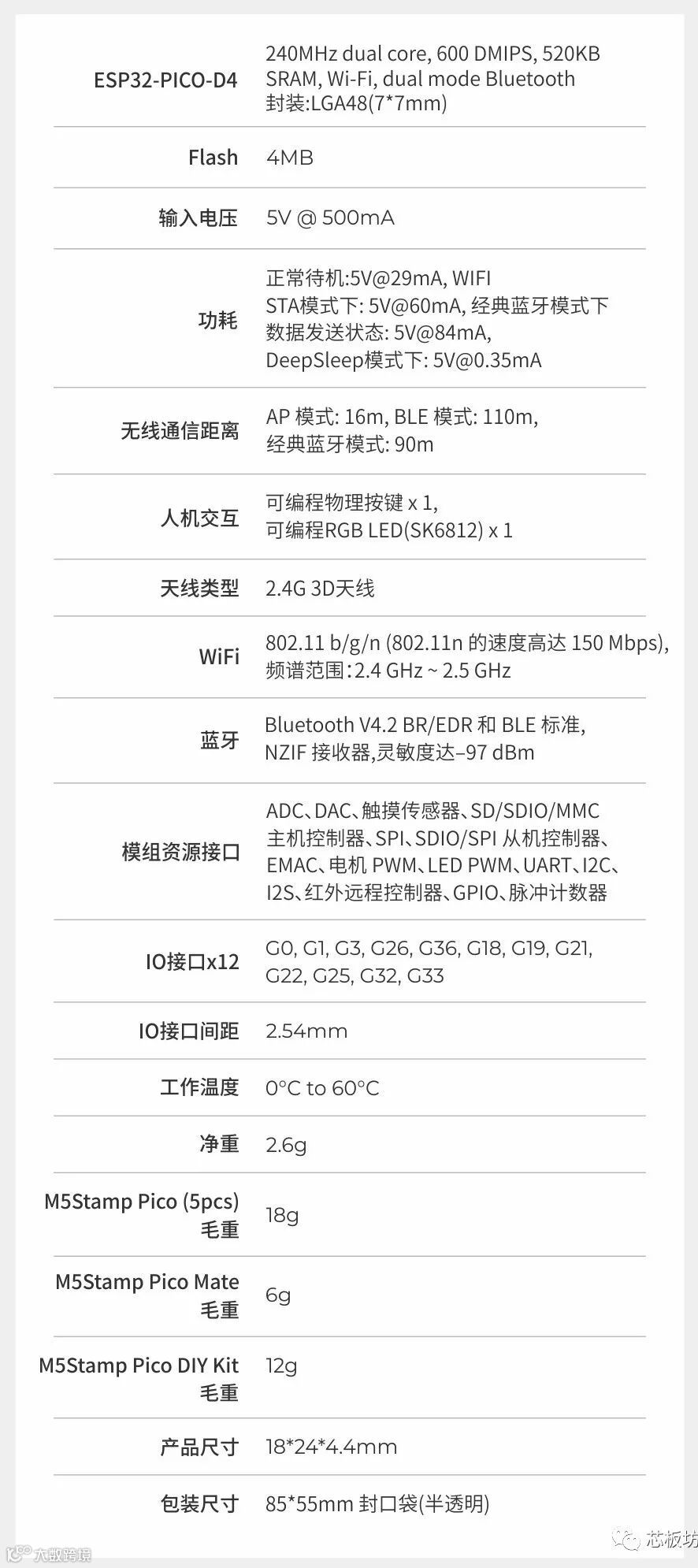 内含5V->3.3V DC/DC电路、GPIOx12、可编程RGB灯x1、按键x1