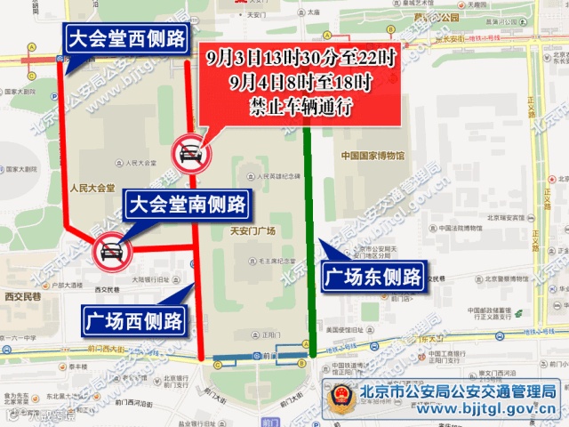 9月3日13时30分至22时,9月4日8时至18时,天安门广场西侧路,大会堂南侧路、西侧路,实施临时交通管制措施,除持有论坛专用证件的车辆外,禁止其他车辆通行。社会车辆和公交车可以经天安门广场东侧路绕行。