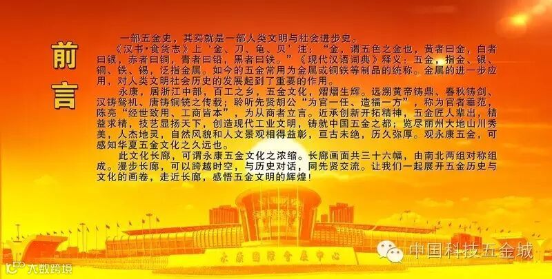 据了解,五金文化长廊各长38米,南北两组对称组成,长廊画面共三十六幅,由五金城集团宣传信息部经过前期多次样式设计修改、图片收集整理筛选后而展示的五金文化以及华东飞渡、厚吴遗韵、圆周花苑等极富我市特色风土人情的画面。