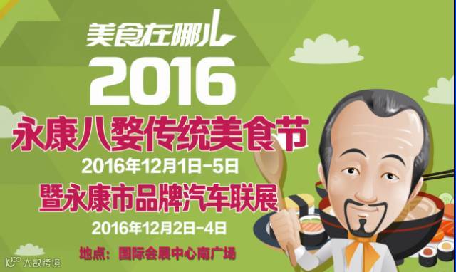 不去品品味,对不起咱的胃!冲冲冲!2016永康八婺传统美食节12月1日与您相约永康国际会展中心,同期还将举办永康市品牌汽车联展,届时与小伙伴们不见不散哦!