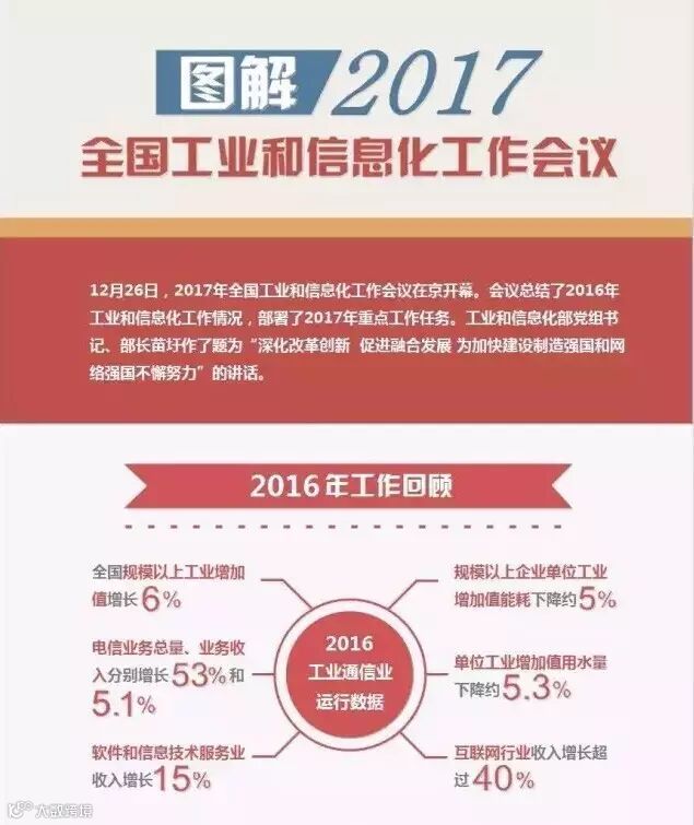 2017年全国工业和信息化工作会议今日在京开幕。会议总结了2016年工业和信息化工作情况,并对2017年重点工作任务进行了部署。戳下图,一图速读↓↓