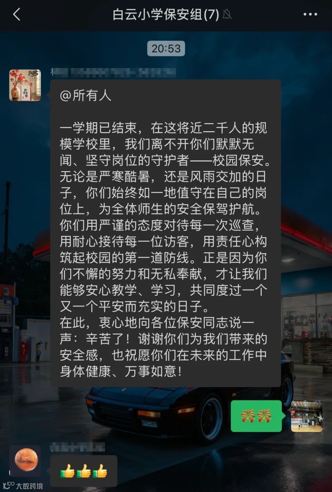 短信中提到,公司驻校保安队伍始终以高度的责任感和严谨的工作态度,严格落实校园安全管理要求。无论是日常执勤、出入管控、突发事件应对,还是协助学校开展安全演练、维护上下学秩序,他们均展现出过硬的专业技能和温暖的服务意识,为师生营造了安全、和谐的学习环境。校方表示:“他们不仅是校园安全的守护者,更是孩子们心中的‘暖心叔叔’。”