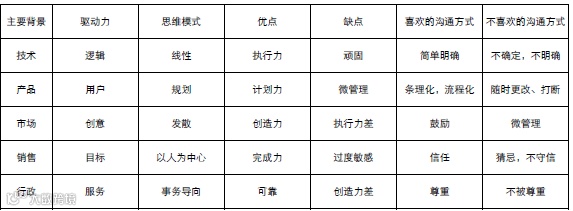 CEO 自身迭代也是一个问题,你不迭代,你的团队就没有办法迭代,你招的人肯定比你差,如果你没有办法成长的话,你就没有办法把这个公司做得很大。你要应对不同背景的人,不是简单增强自己的人际交往能力就可以完成的,你要理解他们的思维逻辑能力,通过领导他们来引导公司的团队。具体来说,大部分的创业公司人无非求五种背景,背景复杂的就是这五种的糅杂,技术、产品、市场、销售和行政,不同背景的人有不同的思维驱动力以及优点和缺点,喜欢的沟通方式和不喜欢的沟通方式。如下图所示: