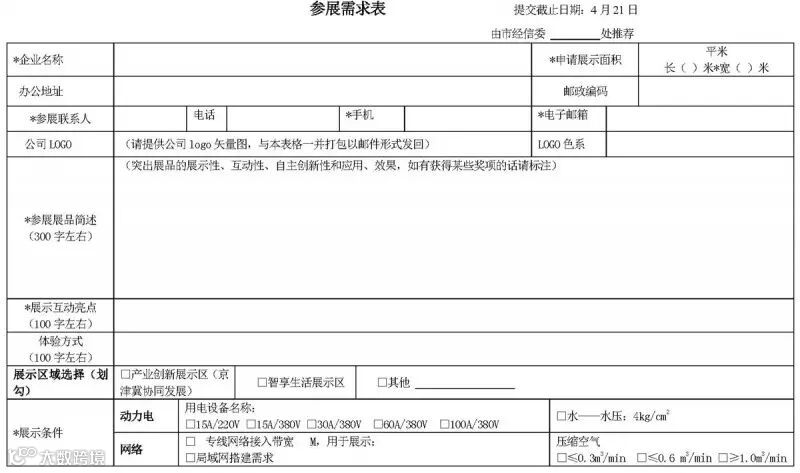 现邀请征集各相关单位参展,展示内容以上述展览主题和内容为方向,在形式上注重新颖性、创新性、高科技含量和互动体验,展示创新产品及解决方案,彰显本单位技术实力。纳入“智慧北京”展区的参展企业均免交场租和展台搭建费。(特装费用除外)请有参展意向的单位于4月21日前填写参展需求表(见附件2)并发邮件至zhangwen@bjeit.gov.cn报名。