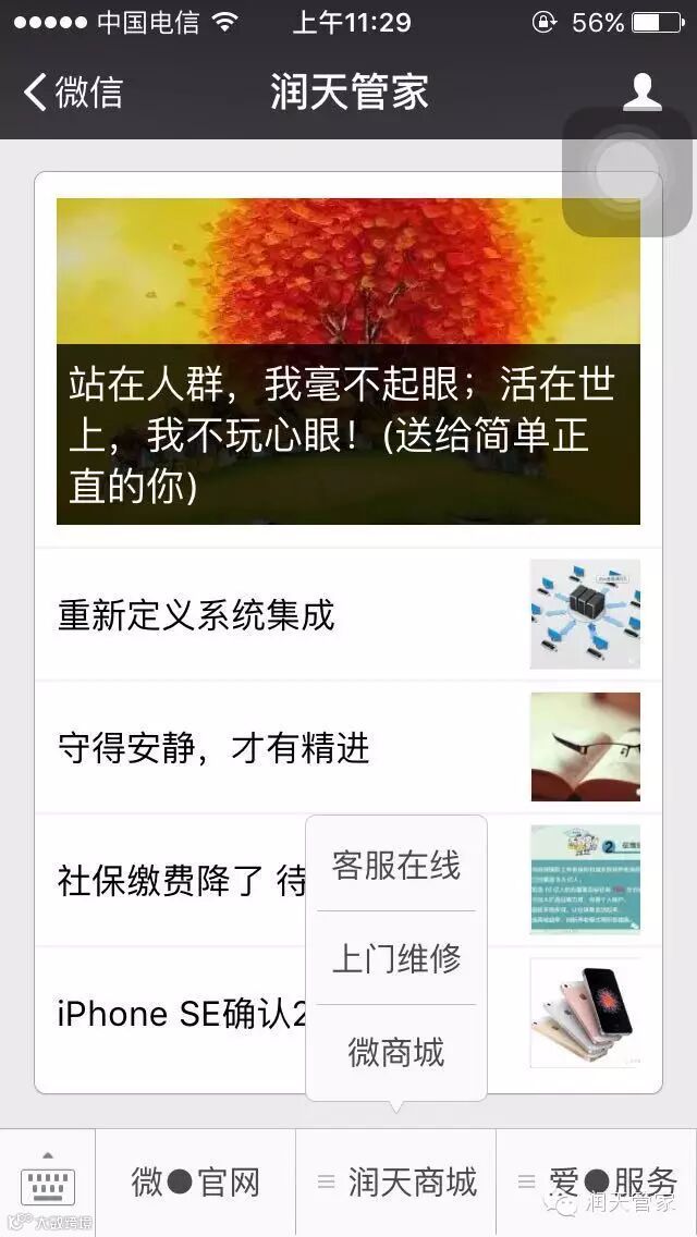 微信公众号搜索“润天管家”,关注后按下图所示点击进入润天商城