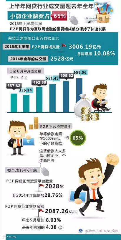 今年上半年,伴随“互联网+”和“大众创业,万众创新”的春风,互联网金融发展加速。P2P网贷作为互联网金融的重要组成部分保持了快速发展,成为纾解小微企业、新创业企业融资难问题的重要渠道。数据显示,百万元以下的小微企业融资占65%。