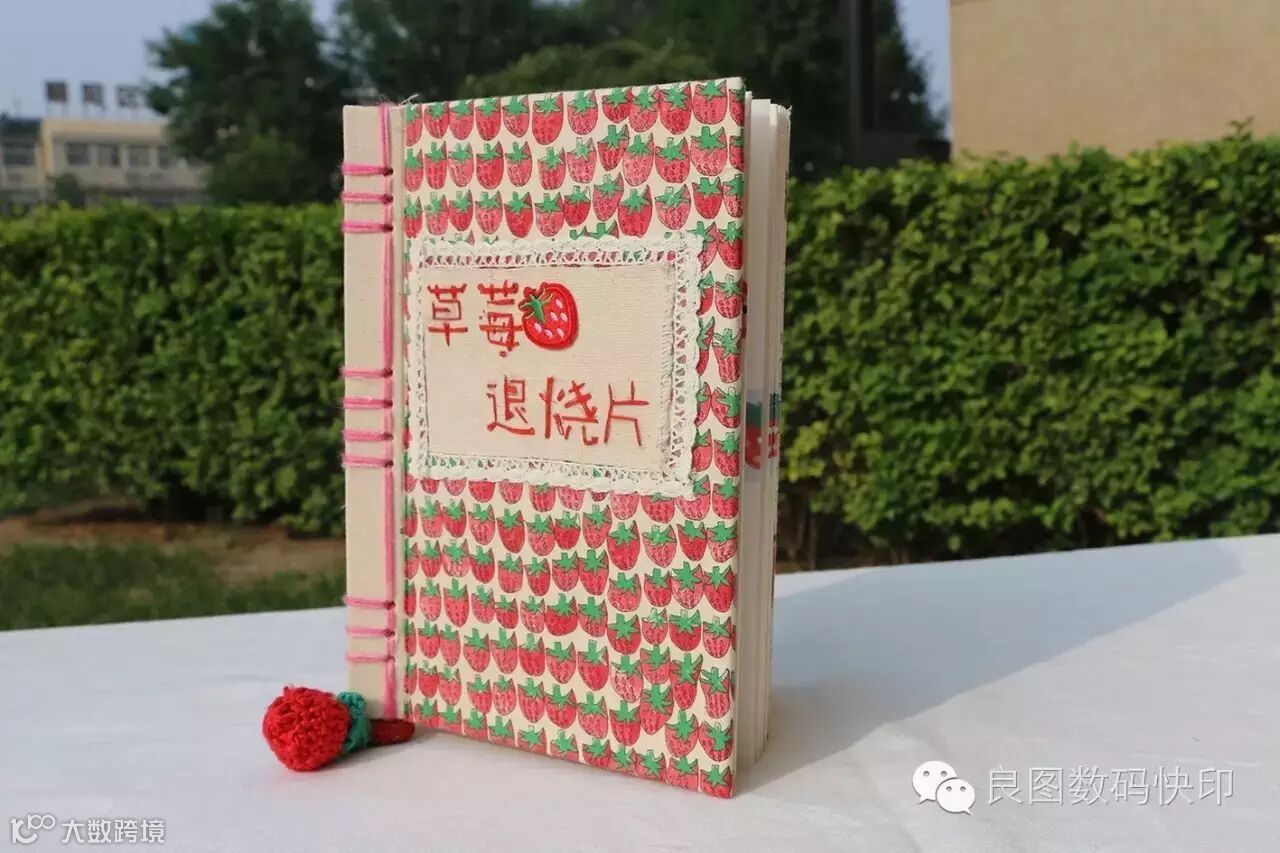 《草莓退烧片》:学生自带的零碎布片和小饰品,经过良图装帧师的巧妙结合,顿时俏皮感倍增,也符合该同学的设计主题。首先将纯手工刺绣的草莓图案布片裱在硬壳上,标题四周手工缝制的蕾丝花边,十分可爱;内页采用淡黄色环保纸张,手感光滑不刺眼;而仿古装订并没有让这本书显得老气,粉红色的线和手工编织的草莓装饰反而显得既时尚又活泼。