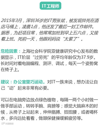 近些年,猝死事件屡有发生。小编综合各方资料,总结出十大猝死危险行业,并采访相关专家进行解读。该排行虽不能一概而论、直接对号入座,却能帮助大家重新审视自己的生活和工作。戳文↓看看你的职业上榜了没?
