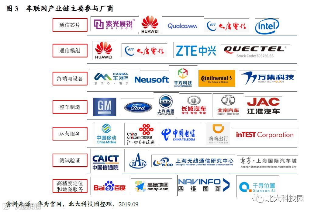 在V2X产业链前端(包括通信芯片、通信模组、终端与设备),通信基础设施提供商及各类电子设备厂商进行了大规模布局,主要厂商有华为、中兴、大唐电信、均胜电子、德赛西威等。