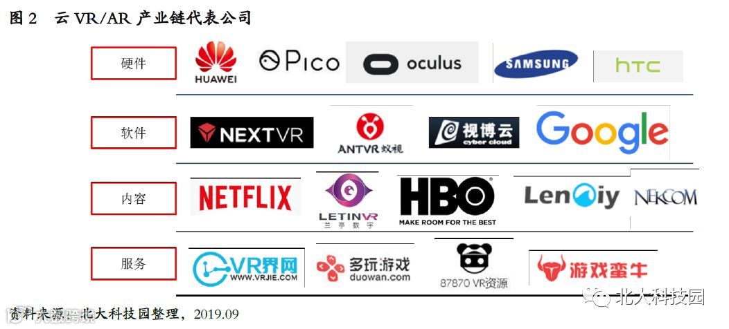 云VR/AR产业链主要包括硬件、技术、软件、内容、分发平台等。
