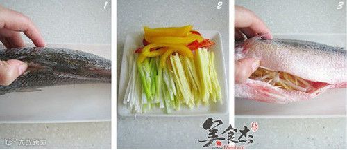 7、依次在鱼身上铺上葱姜丝和彩椒条
